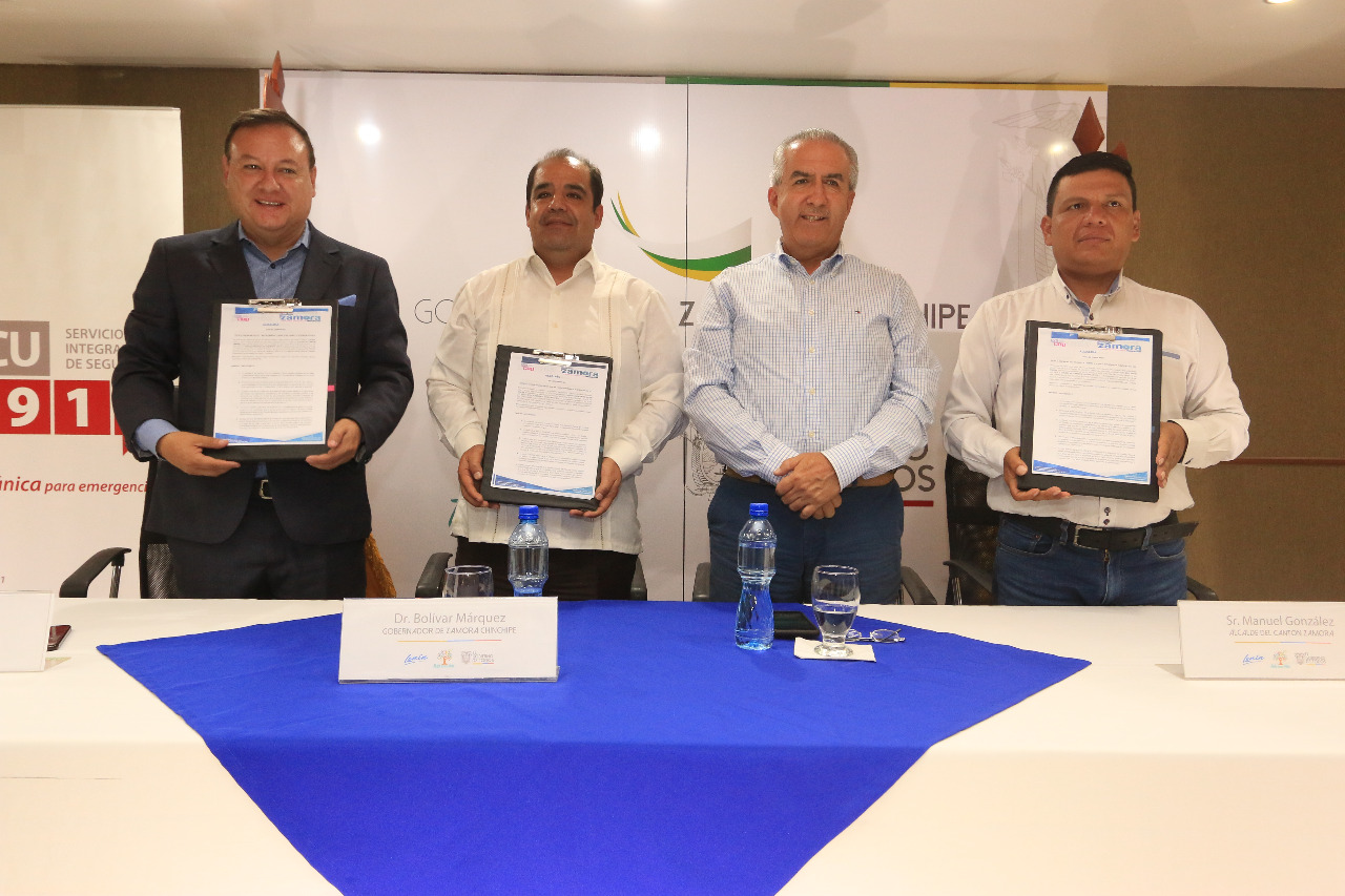 Zamora.- La firma de la Carta de Compromiso se realizó entre Juan Zapata, director Nacional del Servicio Integrado de Seguridad Ecu 911, Manuel González, alcalde del cantón Zamora y Bolívar Márquez, gobernador de la provincia, como testigo de honor para la donación de un terreno de 912.97 m2 que serán destinados para la construcción del Centro Operativo Local ECU 911.